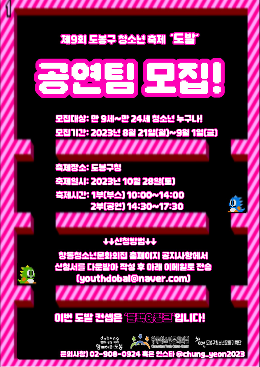 ¾È³çÇϼ¼¿ä! û¿¬ÀÔ´Ï´Ù😃µµ¹ßÀÌ ¾î´Àµ¡ 2´Þ ¾ÕÀ¸·Î ¼ºÅ ´Ù°¡¿Ô½À´Ï´Ù!😆¿ÃÇØ´Â µåµð¾î ¸¶½ºÅ©¸¦ ¹þ°í ¸¸³ª´Â ¸¸Å´õ¿í ±â´ë°¡ µÇ´Âµ¥¿ä!!!!!Á¦9ȸ µµºÀ±¸Ã»¼Ò³âÃàÁ¦ µµ¹ßÀ» ºû³»ÁÖ½Ç °ø¿¬ÆÀÀ» ¸ðÁýÇÏ¿À´Ï ¸¹Àº °ü½É ºÎʵ右´Ï´Ù!! ! µµ¹ß °ø¿¬ÆÀ 2Â÷ ¸ðÁý °øÁö !1. ¸ðÁý´ë»ó: µµ¹ß¿¡ Âü¿©ÇÏ°í ½ÍÀº °ø¿¬ÆÀ ´©±¸³ª2. ¸ðÁý±â°£: 2023³â 09¿ù 02ÀÏ(Åä) ~ 09¿ù 13ÀÏ(¼ö)3. ¸ðÁýºÐ¾ß: ´í½º, ¹êµå, ÈüÇÕ, º¸Äà µî4. °ø¿¬ÀÏÀÚ: 2023³â 10¿ù 28ÀÏ(Åä) 14:30~17:305. ÃàÁ¦Àå¼Ò: µµºÀ±¸Ã»6. ½Åû¹æ¹ý: ½Åû¼ ÀÛ¼º ÈÄ youthdobal@naver.com À̸ÞÀÏ Á¦Ãâ*7ºÐ À̳» ¿¬½À ¿µ»ó Çʼö÷ºÎ7. ÇÕ°ÝÆÀ °ø°í: 9.16.(Åä)*½Åû¼ ¹× ¿¬½À ¿µ»óÀ¸·Î ¿Àµð¼Ç ÁøÇà ÈÄ ÃÖÁ¾ ¼±¹ßÆÀ ¼±Á¤ ¿¹Á¤**¸ðµç ÀÏÁ¤Àº ÁÖÃÖ Ãø »çÁ¤¿¡ µû¶ó º¯µ¿µÉ ¼ö ÀÖ½À´Ï´Ù.