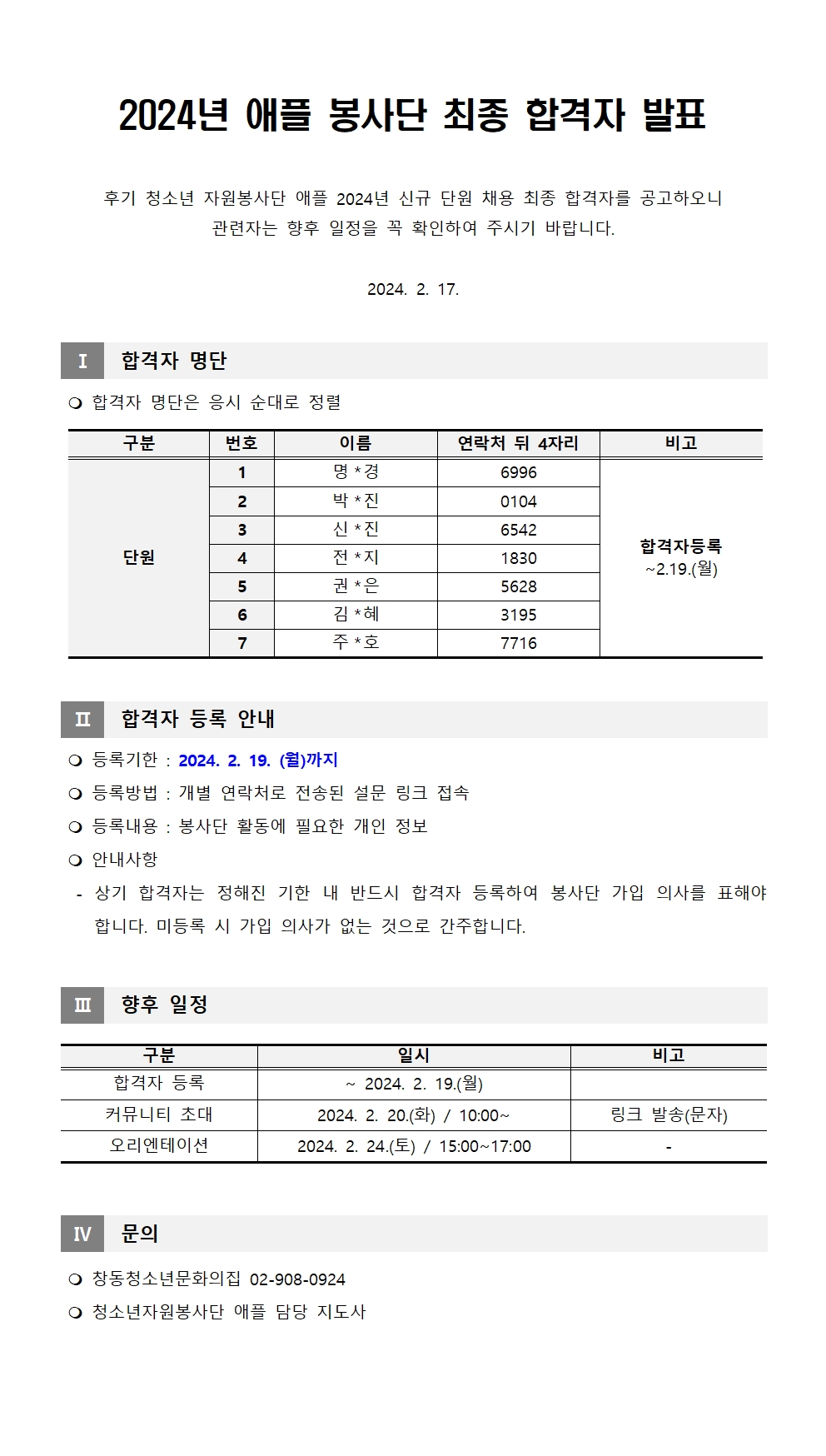 2024³â û¼Ò³âÀÚ¿øºÀ»ç´Ü ¾ÖÇà ÃÖÁ¾ ÇÕ°ÝÀÚ¸¦ »ó±â¿Í °°ÀÌ °ø°íÇÏ¿À´Ï °ü·ÃÀÚ´Â ÇâÈÄ ÀÏÁ¤À» È®ÀÎÇÏ¿© Áֽñ⠹ٶø´Ï´Ù.