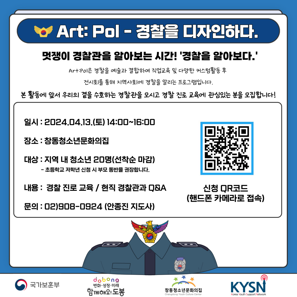 ¾ðÁ¦³ª ¿ì¸® °çÀ» ÁöŰ´Â ¸ÚÀïÀÌ °æÂû°ü¿¡ ¾Ë°í½Í´Ù¸é?°æÂû°ü ÃÊû Áø·Î±³À°¿¡ °ü½ÉÀִºеéÀ» ¸ðÁýÇÕ´Ï´Ù! ÀϽà : 2024.04.13.(Åä) 14:00~16:00Àå¼Ò : ⵿û¼Ò³â¹®ÈÀÇÁý ´ë»ó : Áö¿ª ³» û¼Ò³â 20¸í(¼±Âø¼ø ¸¶°¨)³»¿ë : °æÂû Áø·Î ±³À° / ÇöÁ÷ °æÂû°üÀÇ Q&A¹®ÀÇ : 02)908-0924 (¾ÈÁ¾Áø Áöµµ»ç)