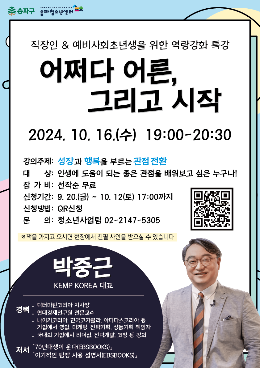 ¼ÛÆÄû¼Ò³â¼¾ÅÍ¿¡¼ Á÷ÀåÀΰú ¿¹ºñ»çȸÃʳâ»ýÀ» À§ÇÑ ¿ª·®°È Ư° <¾î¼´Ù ¾î¸¥, ±×¸®°í ½ÃÀÛ> Âü¿©ÀÚ¸¦ ¸ðÁýÇÕ´Ï´Ù.