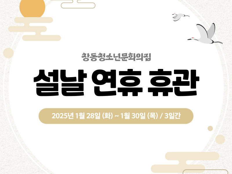 2025³â 1¿ù 28ÀÏ (È) ~ 1¿ù 30ÀÏ (¸ñ)Àº ¼³³¯ ¿¬È޷Π⵿û¼Ò³â¹®ÈÀÇÁý ÈÞ°üÀÏÀÔ´Ï´Ù.