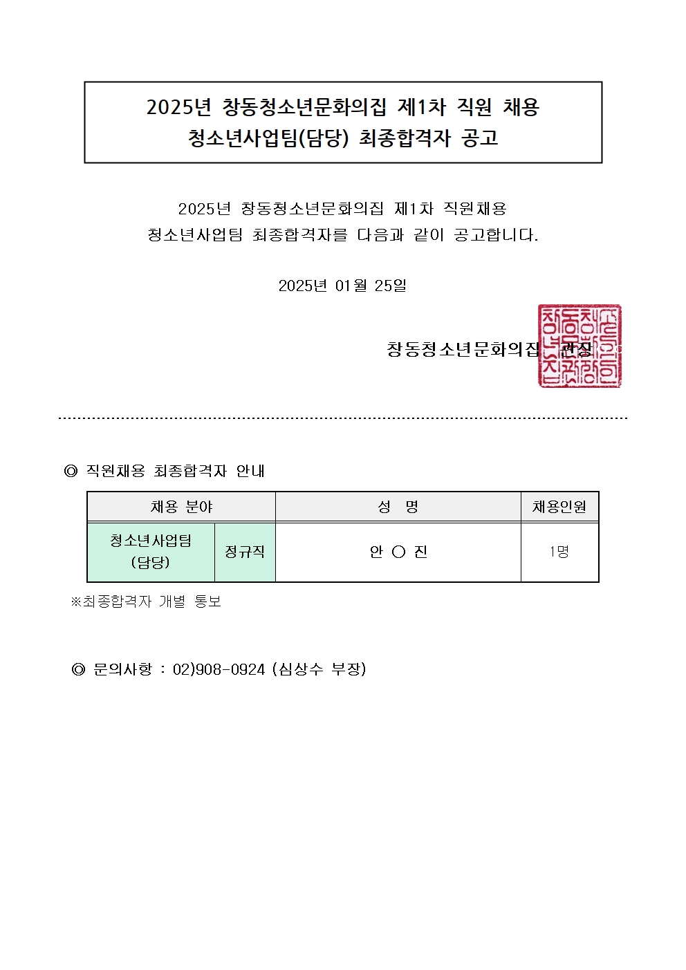 ⵿û¼Ò³â¹®ÈÀÇÁý 2025³â Á¦1Â÷ Á÷¿ø ä¿ë ÃÖÁ¾ÇÕ°ÝÀÚ ¾È³»