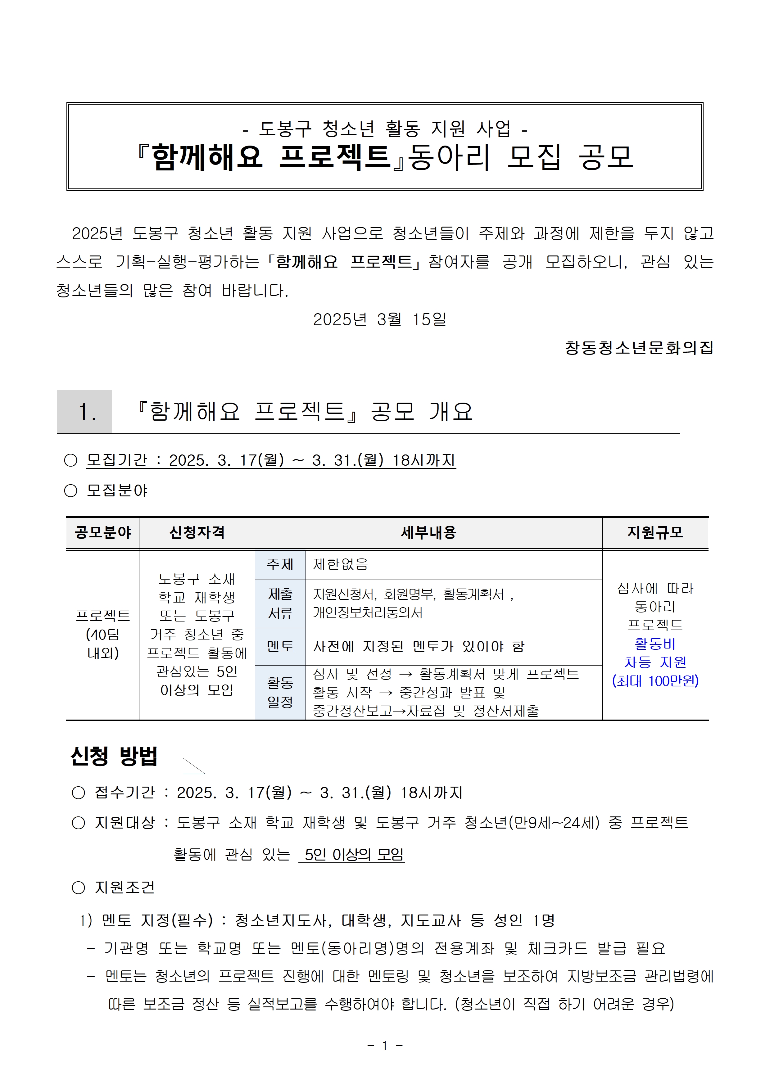 2025³â ÇÔ²²ÇØ¿ä ÇÁ·ÎÁ§Æ® Âü¿© µ¿¾Æ¸®¸¦ ¸ðÁýÇÏ¿À´Ï, °ü½É Àִ û¼Ò³âµéÀÇ ¸¹Àº Âü¿© ¹Ù¶ø´Ï´Ù!