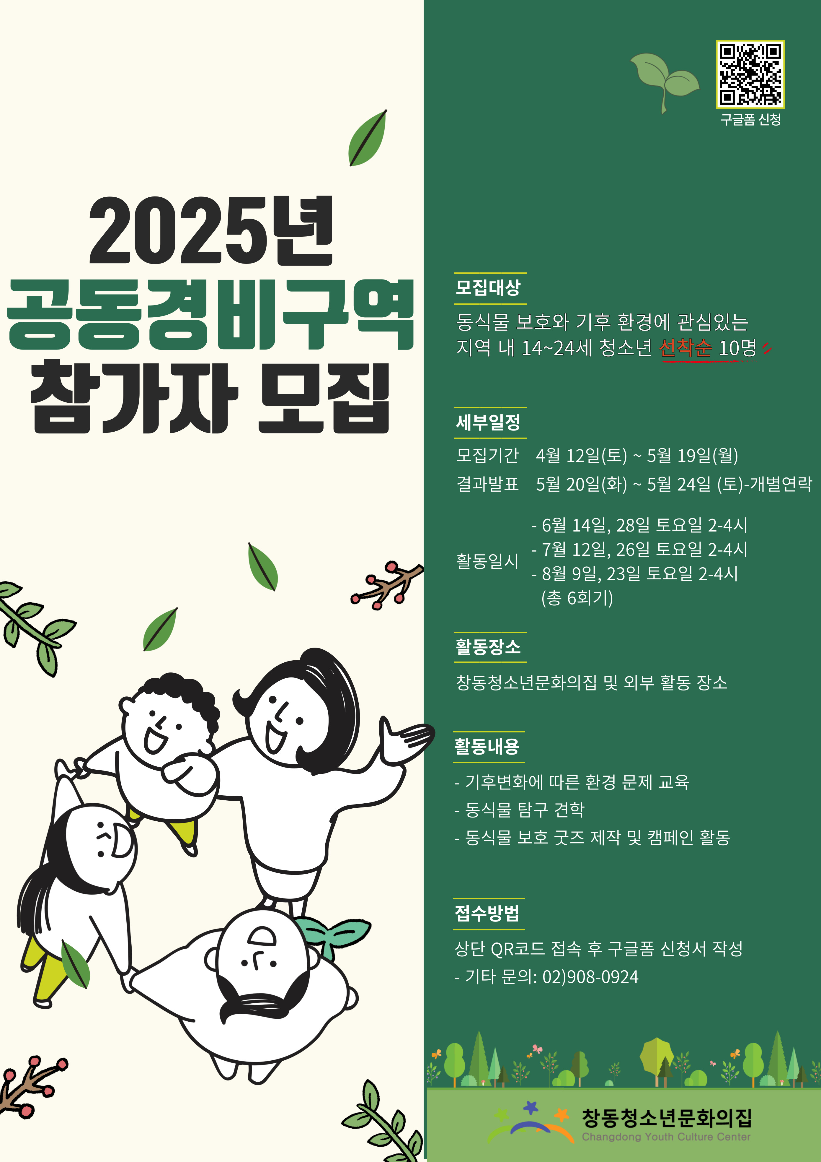 2025³â û¼Ò³â Âü¿©¿¹»êÁ¦ 🌱°øµ¿°æºñ±¸¿ª🌱 Âü°¡ÀÚ¸¦ ¸ðÁýÇÕ´Ï´Ù!🪵 ¸ðÁý ´ë»ó: µ¿½Ä¹° º¸È£¿Í ±âÈÄȯ°æ¿¡ °ü½É ÀÖ´Â 14~24¼¼ û¼Ò³â ¼±Âø¼ø 10¸í🪵 ¸ðÁý±â°£: ~5/19 (¿ù)🪵 Ȱµ¿ ³»¿ë- ±âÈĺ¯È¿¡ µû¸¥ ȯ°æ¹®Á¦ ±³À°- µ¿½Ä¹° ޱ¸ °ßÇÐ- µ¿½Ä¹° º¸È£ ±ÂÁî Á¦ÀÛ ¹× Ä·ÆäÀΠȰµ¿🪵 Á¢¼ö ¹æ¹ý»ó´Ü QRÄÚµå Á¢¼Ó ÈÄ ±¸±ÛÆû ½Åû¼ ÀÛ¼º¸¹Àº °ü½É ºÎʵ右´Ï´Ù 🌿