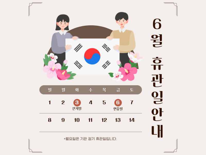 2025³â 6¿ù 3ÀÏ(È) ¼±°ÅÀÏ, 2025³â 6¿ù 6ÀÏ(±Ý) ÇöÃæÀÏÀº ⵿û¼Ò³â¹®ÈÀÇÁý ÈÞ°üÀÏÀÔ´Ï´Ù.½Ã¼³ À̿뿡 Âü°í ºÎʵ右´Ï´Ù.[¹®ÈÀÇÁý ¿î¿µÁ¤º¸]- È~Åä: 9½Ã~21½Ã- ÀÏ: 9½Ã~18½Ã- ¿ù¿äÀÏ ¹× °øÈÞÀÏ ÈÞ°ü