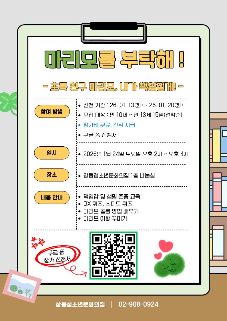 ¢¾ ¸¶¸®¸ð¸¦ ºÎÅ¹ÇØ ¢¾ – ÃÊ·Ï Ä£±¸ ¸¶¸®¸ð, ³»°¡ Ã¥ÀÓÁú°Ô! – 💚 Ã¥ÀÓ°ú »ý¸íÀ» ¹è¿ì´Â ½Ã°£ 🟢 ¸¶¸®¸ð Ű¿ì±â üÇè Ȱµ¿🏠 ³ª¸¸ÀÇ ¸¶¸®¸ð Áý ¸¸µé±â✍️ µ¹º½ ¾à¼Ó Á¤Çϱâ- ÀÏ ½Ã: 2026.1.24.(Åä) 14:00~16:00- Àå ¼Ò: ¹®ÈÀÇÁý 1Ãþ ³ª´®½Ç- ´ë »ó: ¸¸10¼¼ ~ ¸¸13¼¼ û¼Ò³â 15¸í(¼±Âø¼ø ¸ðÁý) - Âü °¡ ºñ: ¹«·á- Á¢ ¼ö: ±¸±ÛÆû ½Åû¼ ÀÛ¼º- ¹® ÀÇ: û¼Ò³âÁöµµ»ç ¹Î¼±Á¤